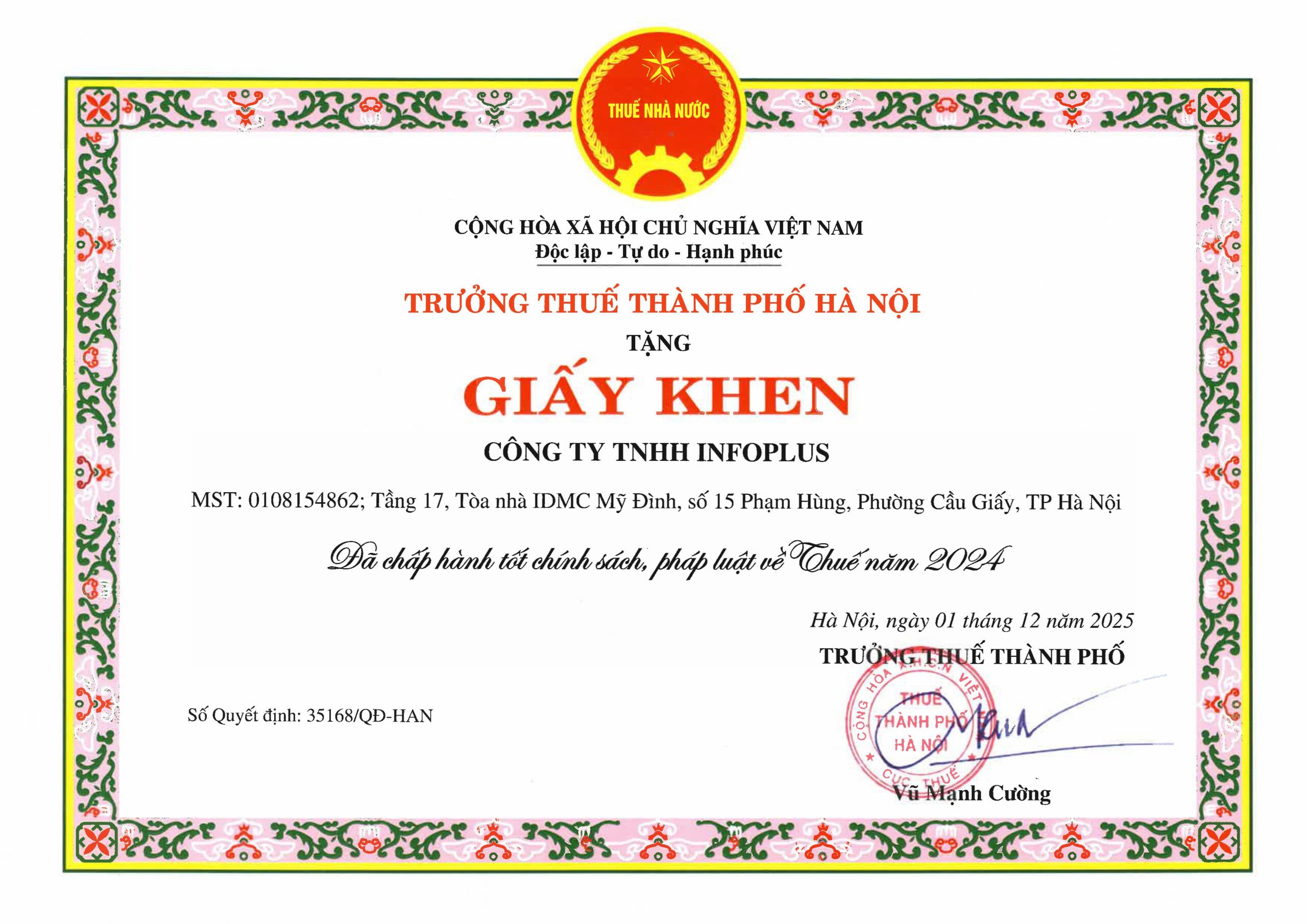 InfoPlus is honored to receive a Commendation awarded by the Director of the Hanoi Tax Department in recognition of its exemplary compliance with tax policies and regulations in 2024. This...