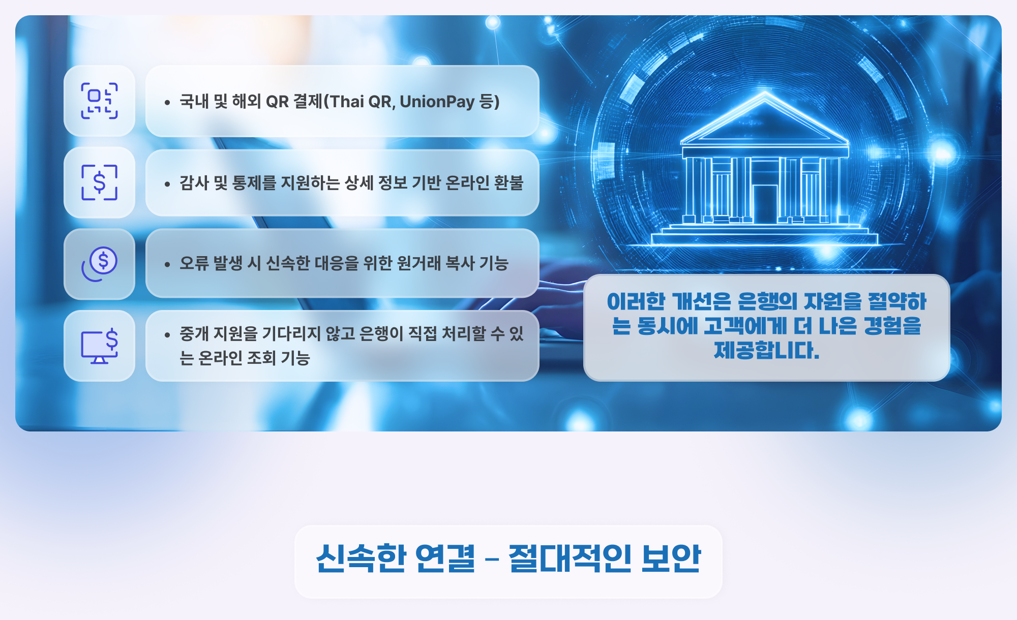 또한 InfoAPI는 중앙 집중형 게이트웨이를 제공하여 은행이 발신 및 수신 거래를 단일 시스템에서 관리할 수 있도록 합니다. 이를 통해 송금, 결제, 정산, 조회 등 모든 거래가 매끄럽게 처리되어 오류를 줄이고 운영 효율성을 극대화합니다.