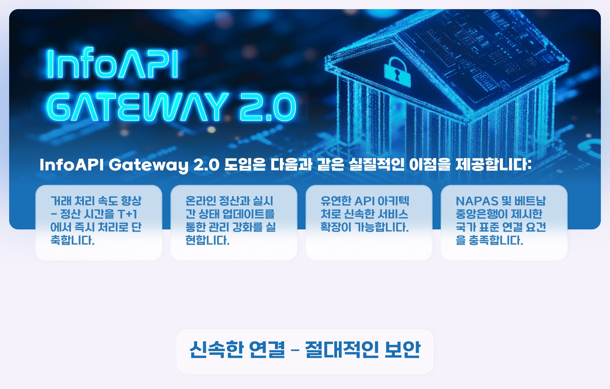 InfoAPI Gateway 2.0을 통해 은행은 단순히 NAPAS IBFT 2.0 시스템에 참여하는 것을 넘어, 새로운 가치를 창출하고 경쟁력을 강화하며 디지털 시대의 입지를 공고히 할 수 있습니다. 이는 은행 업계가 필요로 하는 보안 연결 - 운영 최적화 - 서비스 확장 과제를 동시에 해결하는 해답입니다.