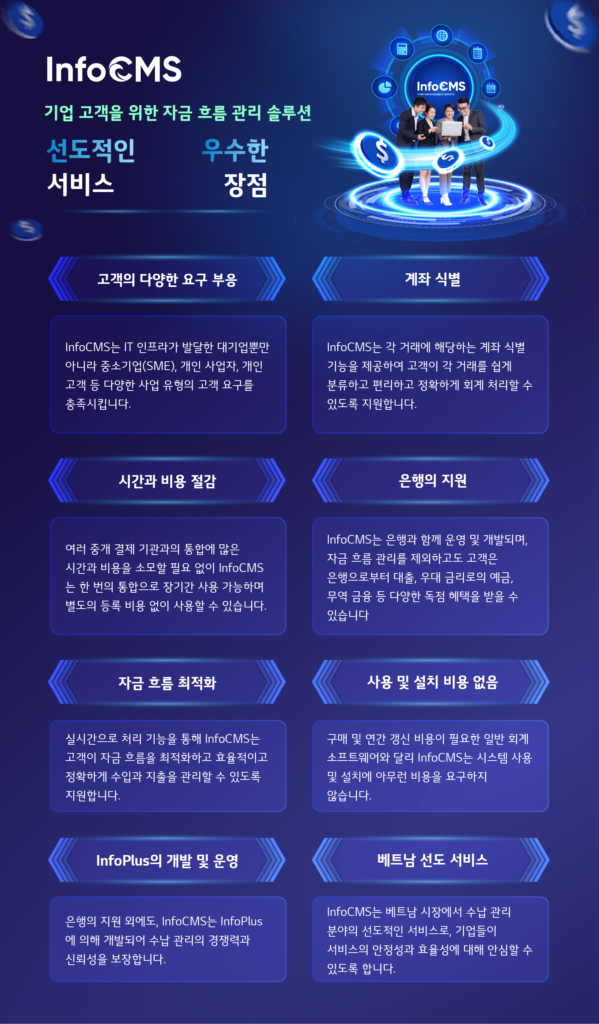 또한, InfoCMS는 VietinBank과 같은 주요 은행들뿐만 아니라 Woori Bank과 Shinhan Bank과 같은 한국의 선도적인 은행들과도 협력하여 다양한 서비스와 국제적인 연계 확장을 실현하고 있습니다. InfoCMS는 단순한 재무 관리 솔루션을 제공하는 것에 그치지 않고 은행들이 고객에게 부가가치를 창출할 수 있도록 지원합니다. 이 서비스를 통해 은행은 고객이 효과적으로 재무를 관리할 수 있도록 지원할 뿐만 아니라 디지털화된 시장에서 지속 가능하고 발전하는 비즈니스 모델을 구축하는 데 중요한 역할을 합니다.