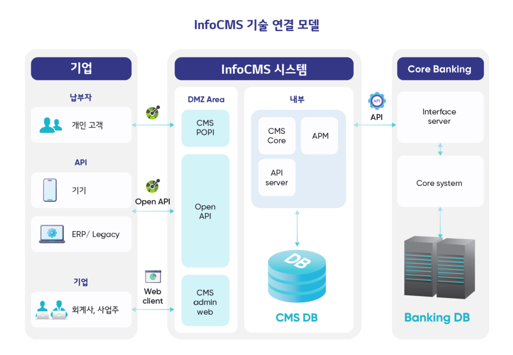 InfoCMS는 고객, InfoCMS 시스템 및 은행의 Core Banking 시스템 간의 통합을 통해 자금 관리 솔루션을 제공합니다. 이를 통해 금융 거래가 정확하게 관리, 처리 및 지속적으로 업데이트되어 고객이 효율적이고 안전하게 자금 흐름을 관리할 수 있도록 지원합니다.
