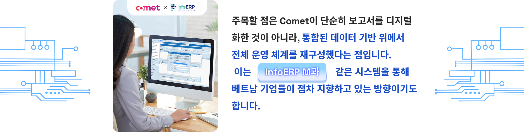 Comet에 클라우드 기반 MES 솔루션을 제공한 42Q의 공식 보고서(2024)에 따르면, Comet은 기존 설비 및 ERP와 직접 연동되는 MES 시스템을 구축했습니다. 그 결과, 수개월 만에 다음과 같은 성과를 달성했습니다.