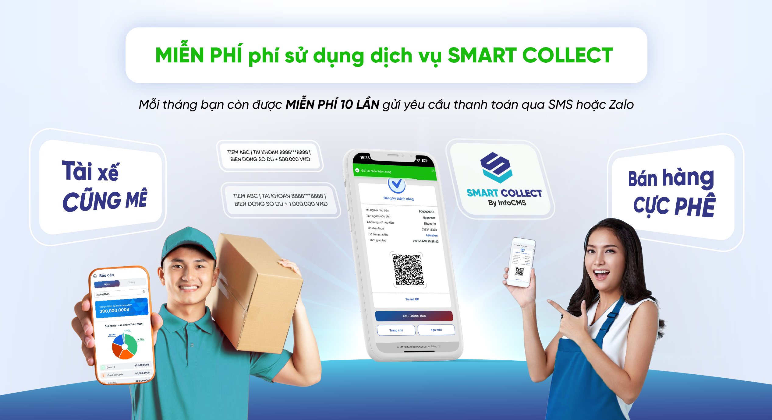 MIỄN PHÍ phí sử dụng dịch vụ SMART COLLECT. Ngoài ra, mỗi tháng bạn còn được miễn phí 10 lần gửi yêu cầu thanh toán qua SMS hoặc Zalo – giúp tăng hiệu quả kinh doanh mà không lo về chi phí.